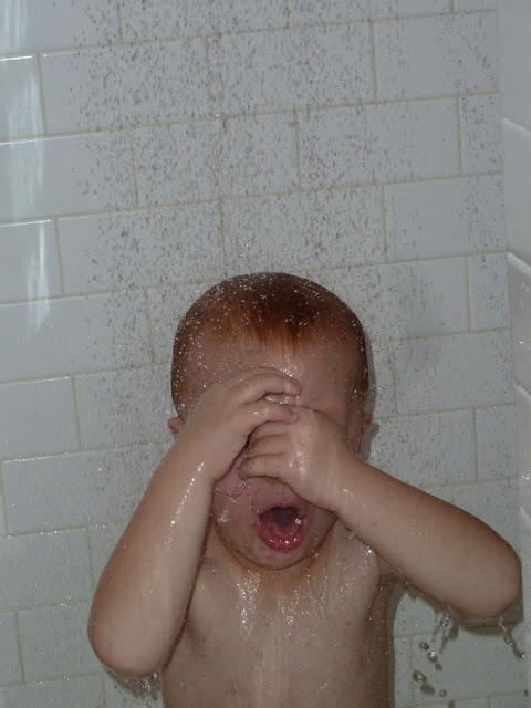 My brother Ryan (the one we stayed with) has a walk-in rain fall shower downstairs. Mac hates showers but we talked him into getting in. Him and Oak LOVED playing in it. Mac even would put his head in the shower a few times. I couldn't get either of them out because they loved it so much!